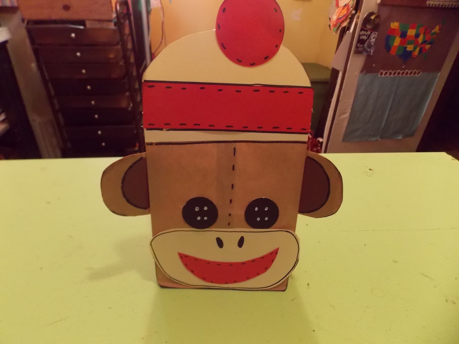 sock monkey favor bags made out of paper sacks, super easy and fun